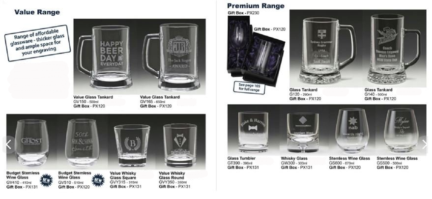 Here is a sample of some of our Trophies, Plaques, Glassware and more!